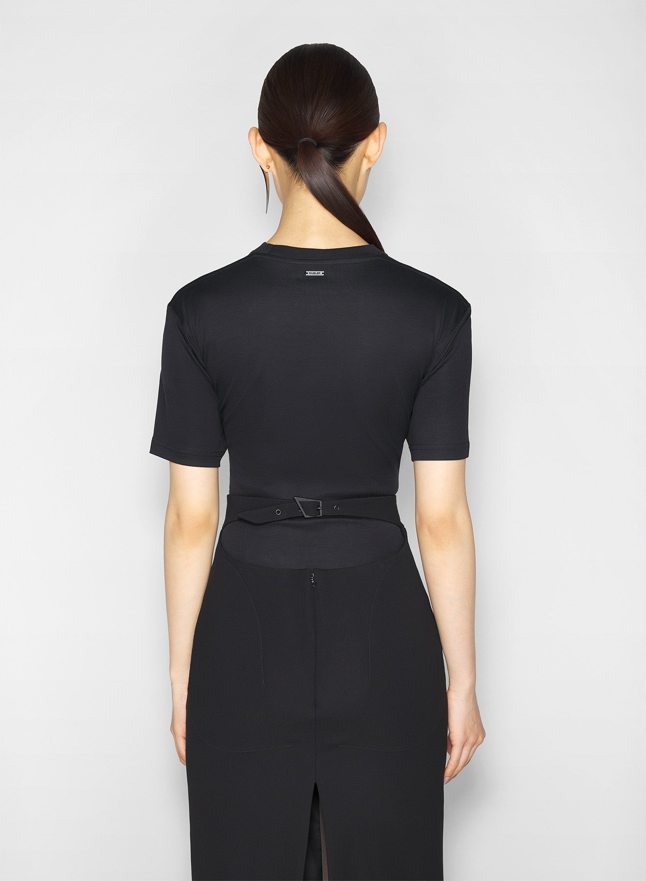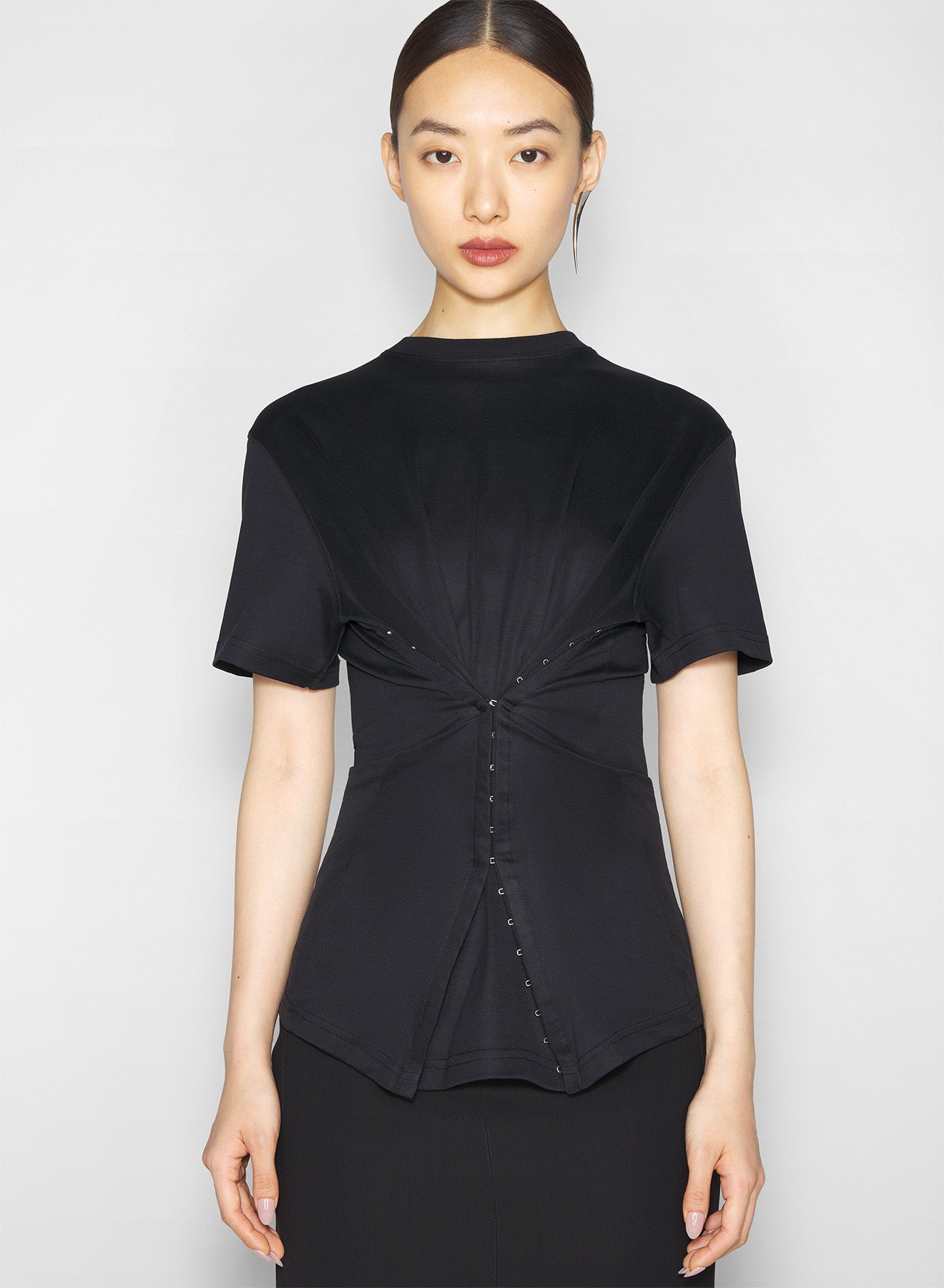 black cinched hook-and-eye t-shirt